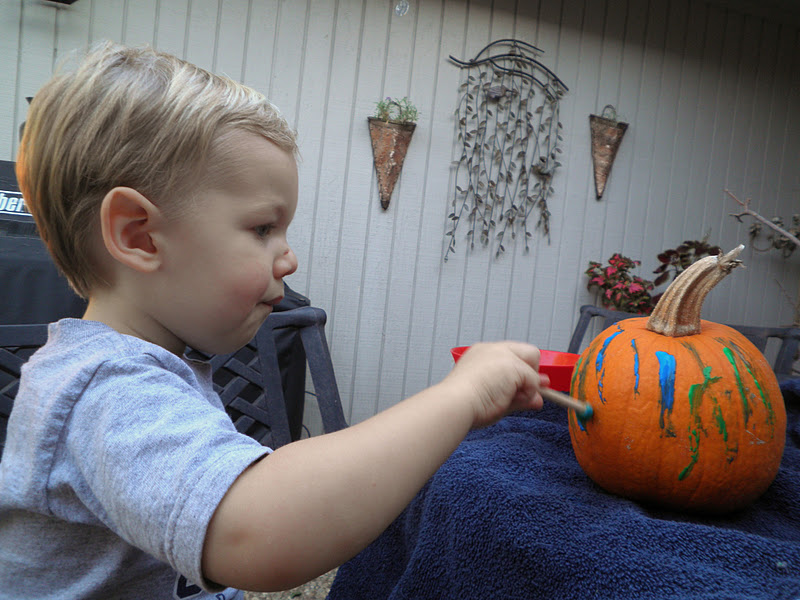 Debbie gave me the great idea of letting Merit paint his own pumpkin. So, I bought him a small pumpkin, got out the paints and let him go to town. Of course, there was much supervision involved. :) We painted outside and I had a towel down too. He had so much fun with this little activity! Thanks Debbie for the idea!