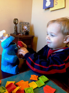 Grandmom and Grandad sent Merit a Target gift card. I knew exactly what I wanted to buy him...a play dough set. He doesn't have one and he's never played with play dough. We picked out a Cookie Monster set because it helps you learn the alphabet and various fruits and vegetables. It is really a neat set. Merit wanted to get it out and play with it as soon as we got home. He had so much fun feeding the letters, fruits and veggies to Cookie Monster!
