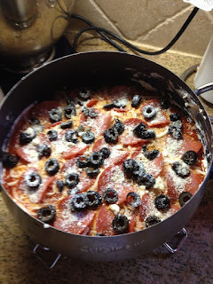 Healthy modifications: I used 1/3 less fat cream cheese, Sargento Light Italian blend shredded cheese, and Turkey Pepperoni. You can use whatever toppings you like on pizza. I chose black olives and pepperoni because those are my favorite. I served this yummy dip with sliced french baguette. I warmed mine in my fondue pot and left it in there so it would stay warm throughout the evening. Delicious!